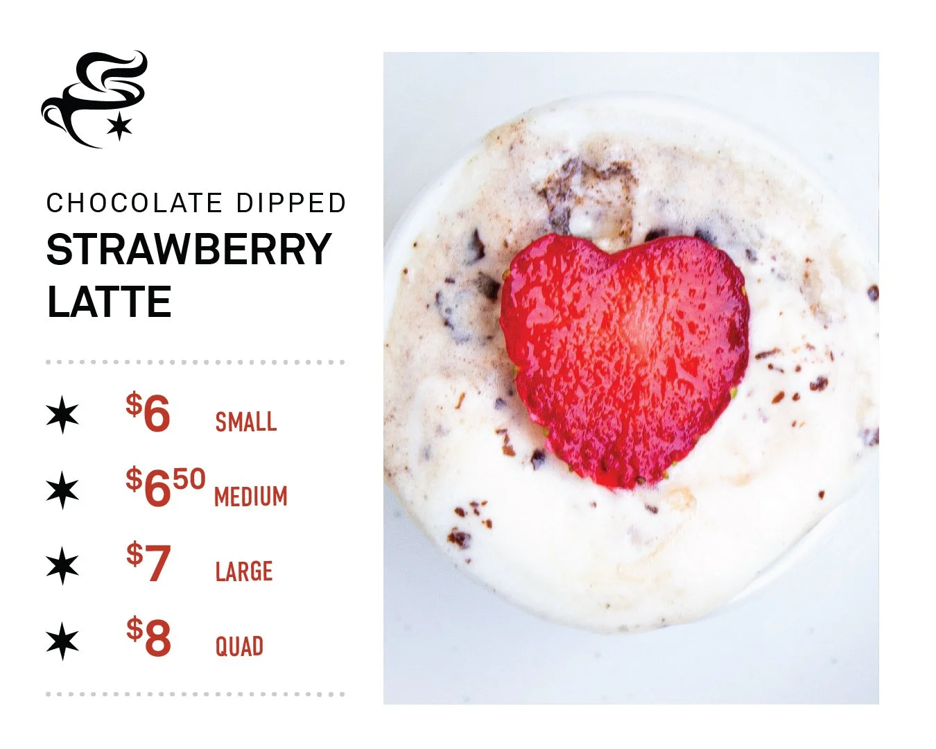 Two Shots of Espresso • Chocolate Syrup • Strawberry Syrup • Milk of Choice • Whipped Cream • Freeze-Dried Strawberries