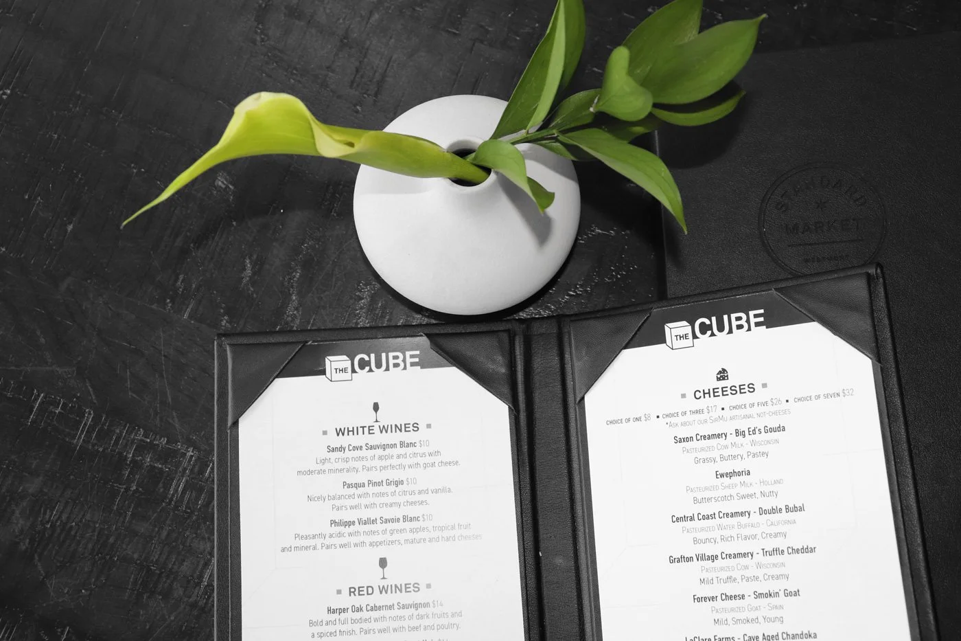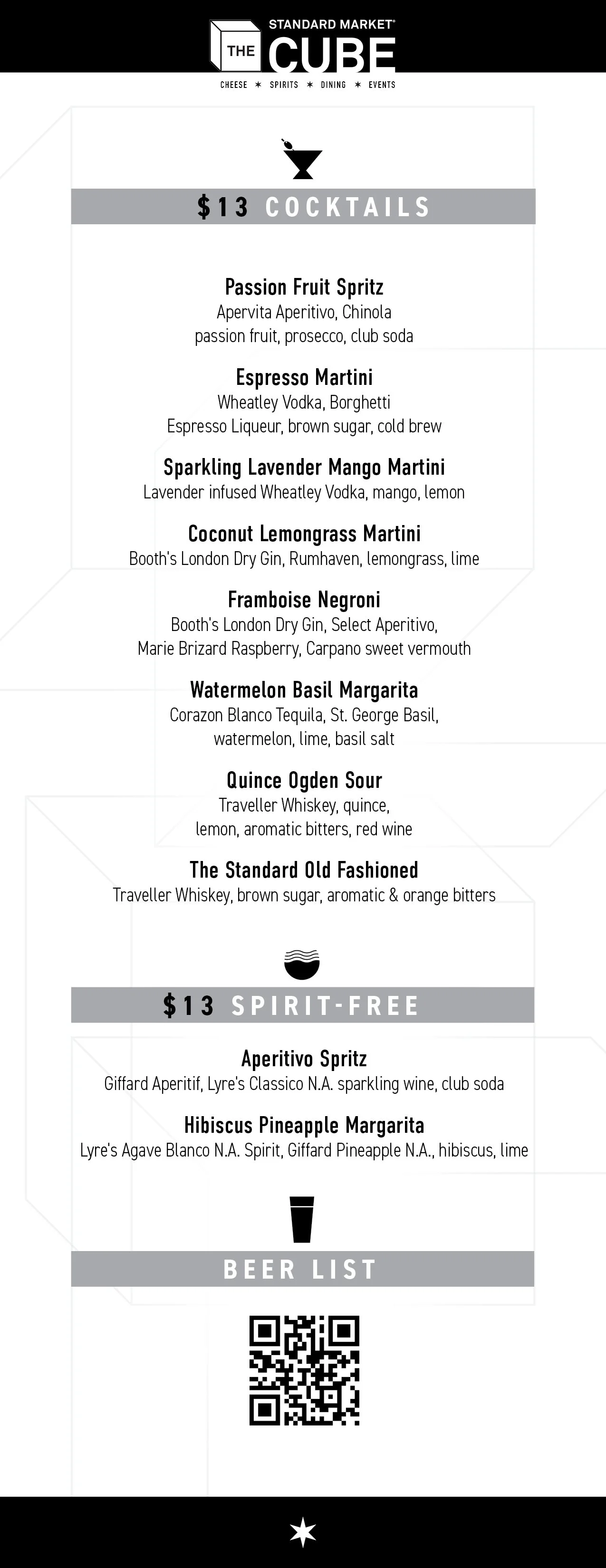 Named for its cube-like shape and located inside the Standard Market - THE CUBE showcases craft beer on tap, a variety of wines and spirits by the glass. Also featured is our rotating seasonal cheese selection, a gastropub-style menu of small and large plates, and fresh sushi made to order.