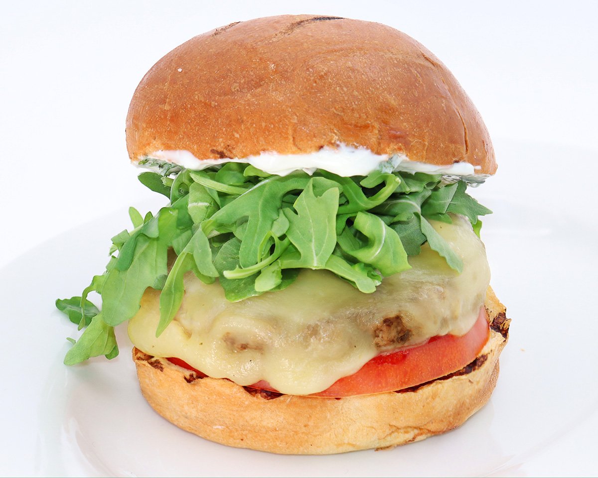 Marketmade patty blend of lamb and beef, creamy melted Point Reyes Toma cheese, arugula, tomato, lemon and herb yogurt spread, on a grilled brioche bun.